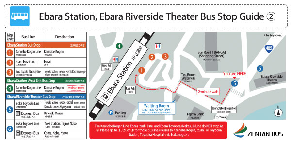 When switching buses at JR Ebara Station, there is a 3-minute walk between the bus stop to/from Kannabe Snow Village and the bus stop to/from Osaka.
