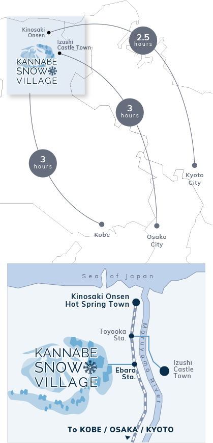 It takes approximately 60 minutes to travel from Kinosaki Onsen Station to Kannabe mountains and ski areas.